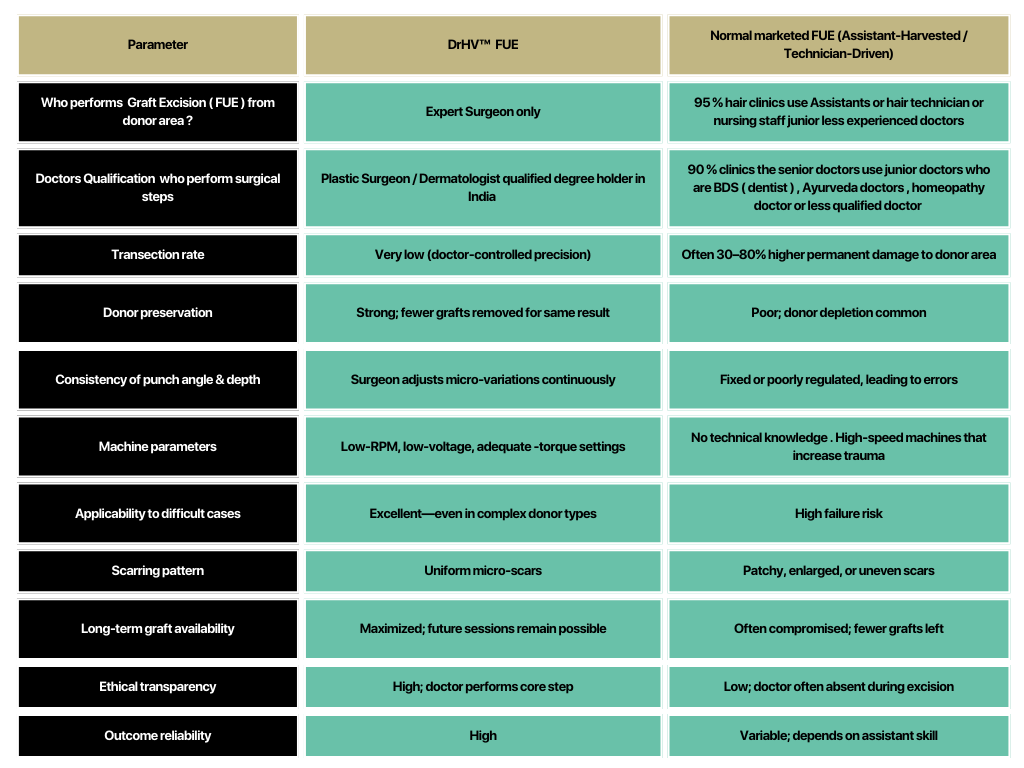 To address this gap and help patients differentiate high-precision, doctor-performed FUE from mass-produced, technician-driven procedures, we introduce DrHV FUE , a FUE protocol in which all graft harvesting is performed exclusively by the surgeon.